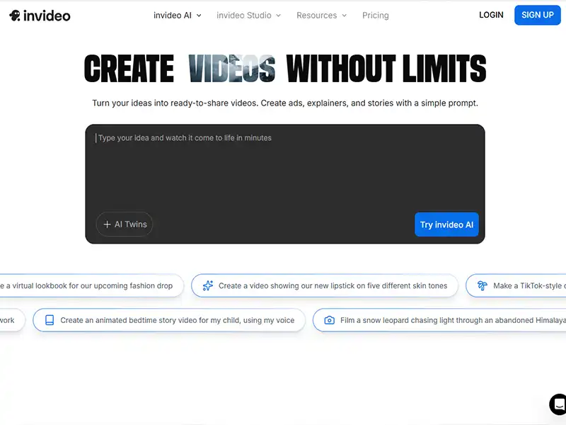 Invideo.io همچنین قابلیت تبدیل متن به ویدیو را نیز دارد که به کمک آن میتوان با وارد کردن متن یا اسکریپت، ویدیو ساخت. نسخه رایگان محدودیت واترمارک دارد و نسخههای غیر رایگان امکانات بیشتری ارائه میکنند.